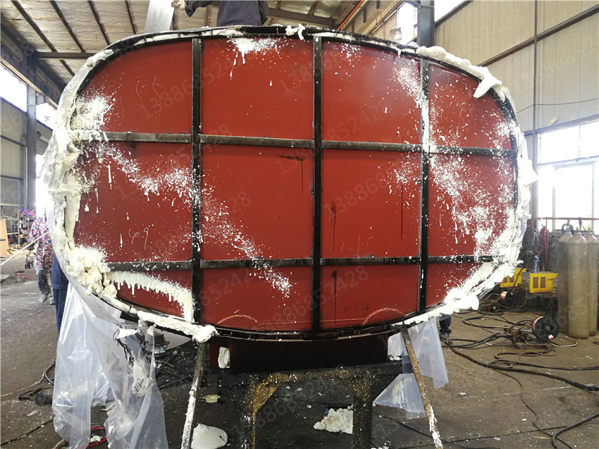 3. 保層溫的制作是在水罐外部另外焊接10mm厚的支撐骨架,然后用保溫材料將骨架內(nèi)部填充滿,**在骨架外蒙上一層外皮。 保溫層外表鐵皮采用8mm厚高強(qiáng)度耐磨板,可選擇使用不銹鋼分鏡面8K或磨砂板